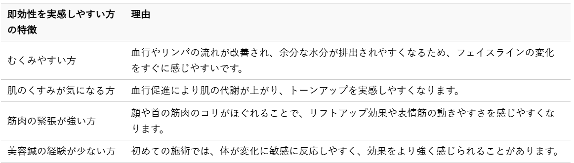 美容鍼の即効性は、個人の体質や肌の状態によって異なりますが、特に以下のような方は効果を実感しやすい傾向にあります。