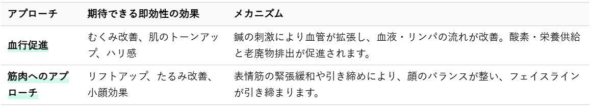 美容鍼の即効性を支える二大メカニズムは、「血行促進」と「筋肉へのアプローチ」です。これらが相互に作用し、小顔効果やリフトアップ、肌質の変化といった目に見える効果を迅速にもたらします。