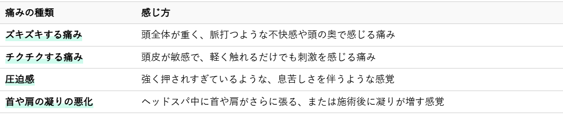 具体的にどのような痛みを感じていますか。多くの方が経験するヘッドスパ中の不快な感覚には、次のようなものがあります。