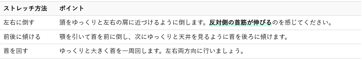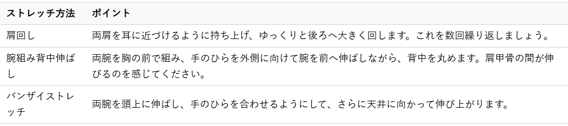 デスクワークなどで同じ姿勢が続く方は、定期的にこれらのストレッチを取り入れることをおすすめします。