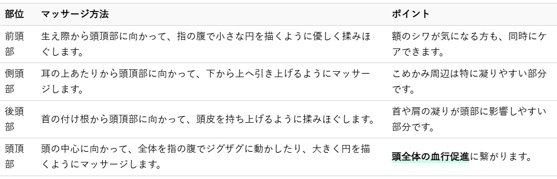頭皮全体をバランス良くケアするために、部位ごとに意識してマッサージを行いましょう。
