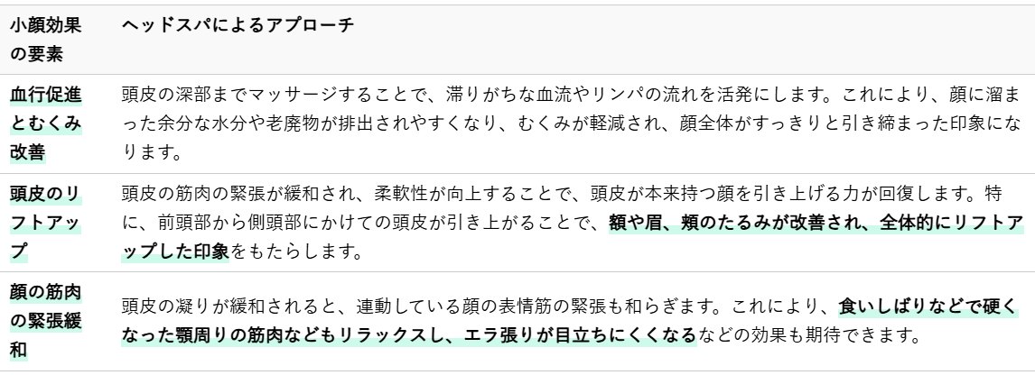 ヘッドスパがもたらす小顔効果は、主に頭皮の血行促進とリフトアップ作用にあります。これらの作用により、顔全体の印象が大きく変わることが期待できます。