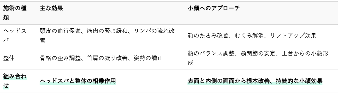 ヘッドスパは頭皮からのアプローチで顔のたるみを改善し、整体は骨格と筋肉の歪みを整えることで顔のバランスを最適化します。このダブルアプローチは、小顔を一時的なものにせず、根本から整えて持続させるための鍵となります。