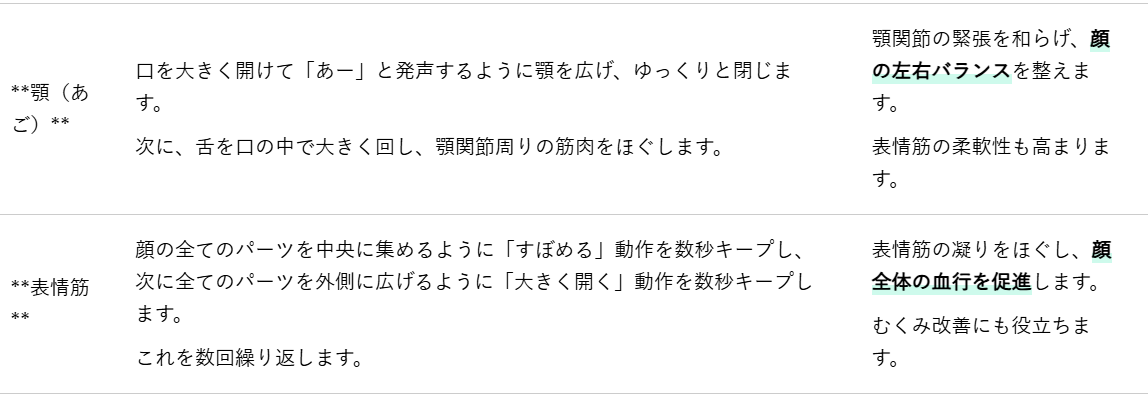 これらのストレッチは、デスクワークの合間や就寝前など、リラックスできる時間に行うのがおすすめです。継続することで、筋肉の柔軟性が高まり、顔の歪み改善や小顔効果をサポートします。
