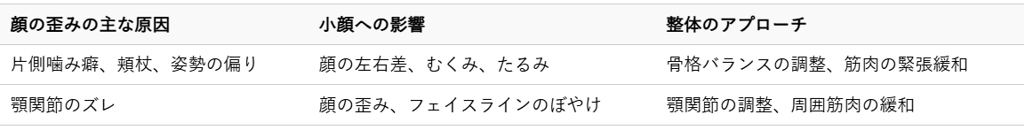 小顔を目指す上で、整体は顔の土台となる骨格と、その周囲の筋肉に直接働きかける重要なアプローチです。顔の歪みや首肩のこりは、見た目の印象に大きく影響し、小顔を遠ざける原因となることがあります。ここでは、整体がどのようにしてこれらの問題にアプローチし、小顔へと導くのかを詳しく解説いたします。