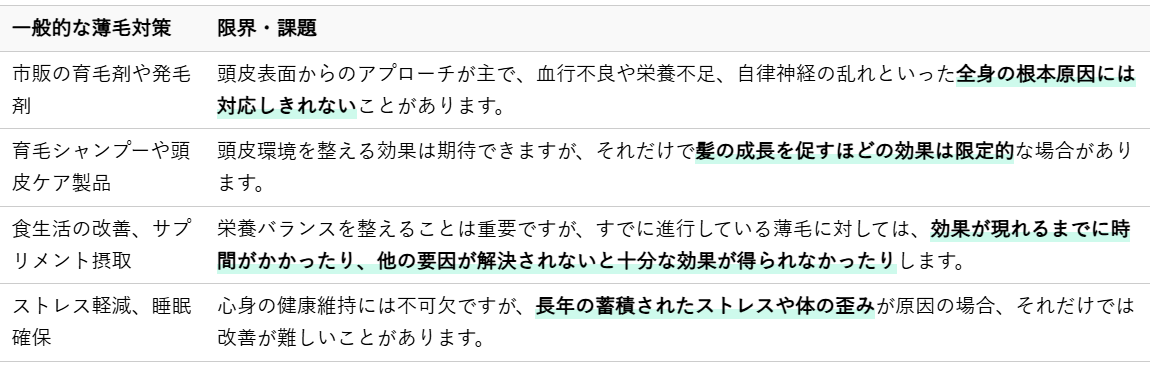 以下に、一般的な薄毛対策とその限界についてまとめました。