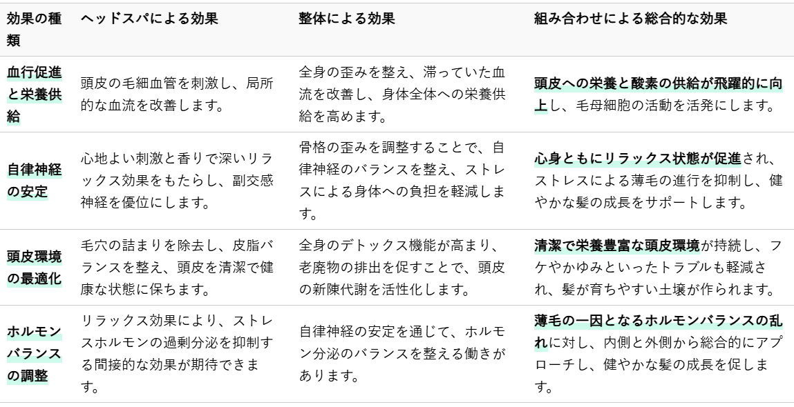 このように、ヘッドスパと整体は、それぞれが持つ効果を補完し合い、単独では得られない強力な薄毛改善効果を生み出します。頭皮と全身の健康を同時にケアすることで、薄毛の根本原因に多角的にアプローチし、あなたの髪本来の力を引き出すことが期待できるのです。