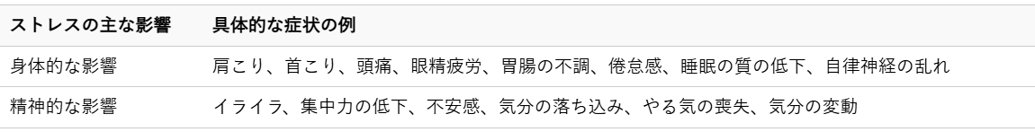 これらの身体的な症状だけでなく、精神的な側面にも影響は及びます。集中力の低下、イライラしやすくなる、気分の落ち込みなど、日々の生活の質を大きく低下させてしまうこともあります。ストレスが引き起こす具体的な心身への影響は、以下の表でご確認いただけます。