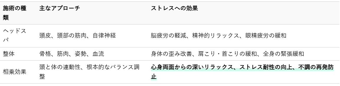 頭部へのアプローチであるヘッドスパと、身体の骨格や筋肉に働きかける整体は、互いに補完し合い、単独の施術では得られないほどの相乗効果を発揮します。それぞれの施術が持つ効果に加え、心身のつながりを意識したケアが、ストレスからの解放を強力にサポートします。