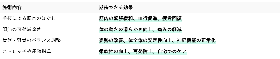 以下に、整体の主な施術内容とそれによって期待できる効果をまとめました。
