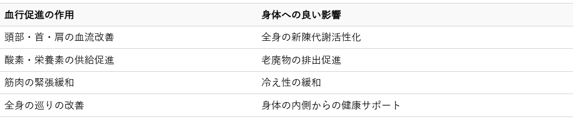 また、血行不良は冷え性の原因の一つとも言われています。頭部から全身へと血流が改善されることで、身体全体の温かさを感じやすくなり、冷え性の緩和にも寄与することが期待されます。身体の内側から健康をサポートする効果があるのです。