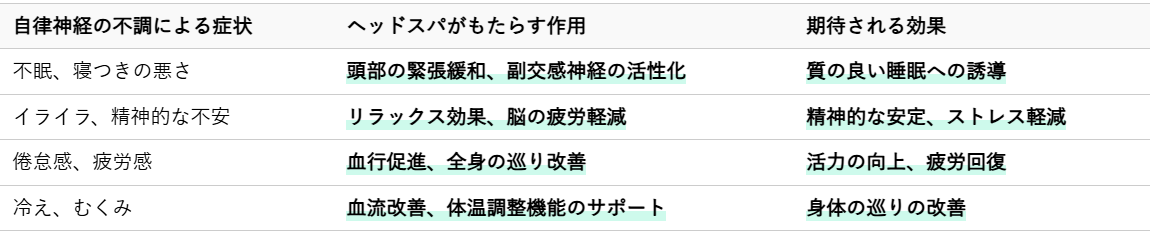 頭部には多くの神経が集中しており、ヘッドスパによる心地よい刺激は、自律神経のバランスを整える上で非常に有効です。特に、頭皮や首筋への丁寧なマッサージは、副交感神経を優位にし、心身ともに深いリラックス状態へと誘います。