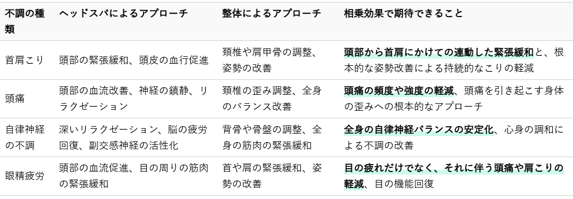ヘッドスパが頭部に特化したアプローチである一方、整体は全身の骨格や筋肉のバランスを整えることで、身体全体の機能向上を目指します。この二つのアプローチを組み合わせることで、症状の根本原因へのより包括的なアプローチが可能になります。