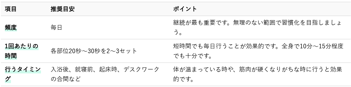 推奨されるストレッチの頻度と時間の目安を以下の表にまとめました。