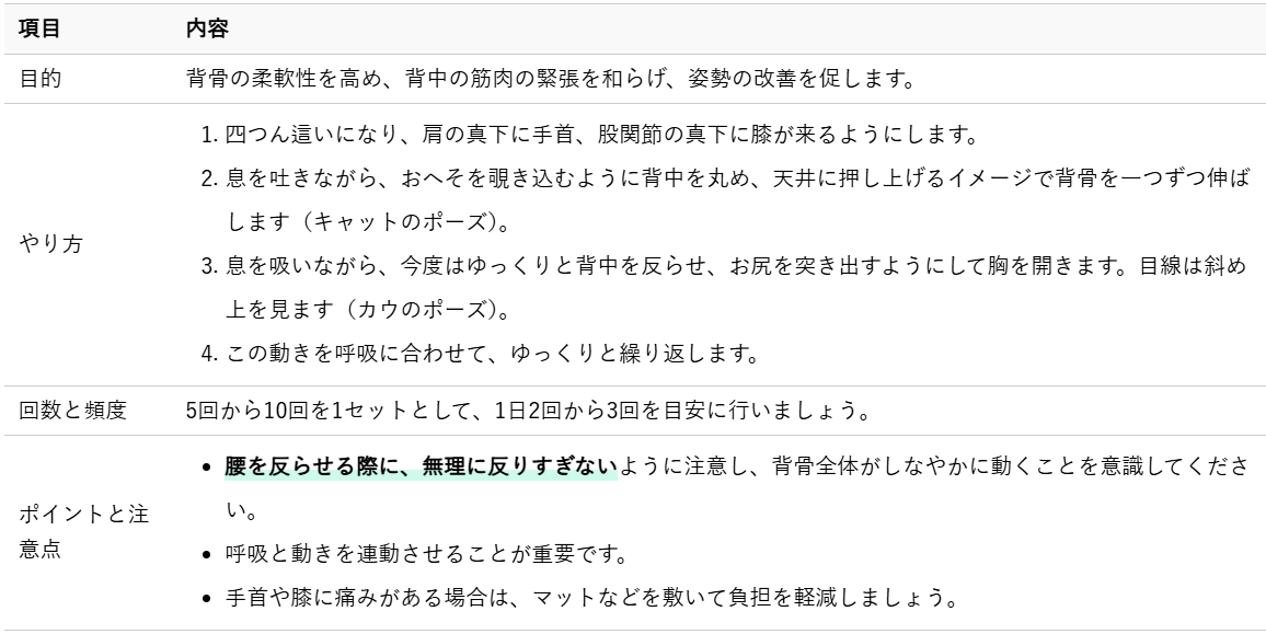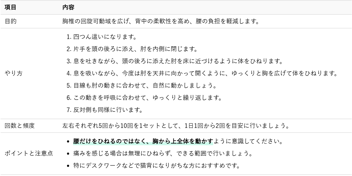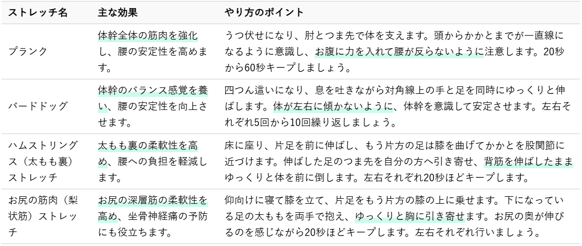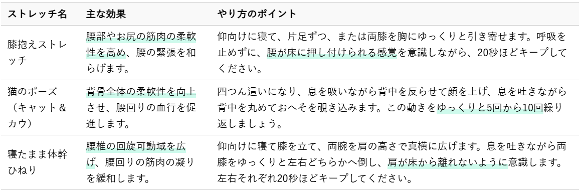 これらのストレッチは、寝起きの硬くなった体を優しく目覚めさせ、日中の活動に向けて腰の負担を軽減する効果が期待できます。無理のない範囲で、毎日の習慣にすることをおすすめします。