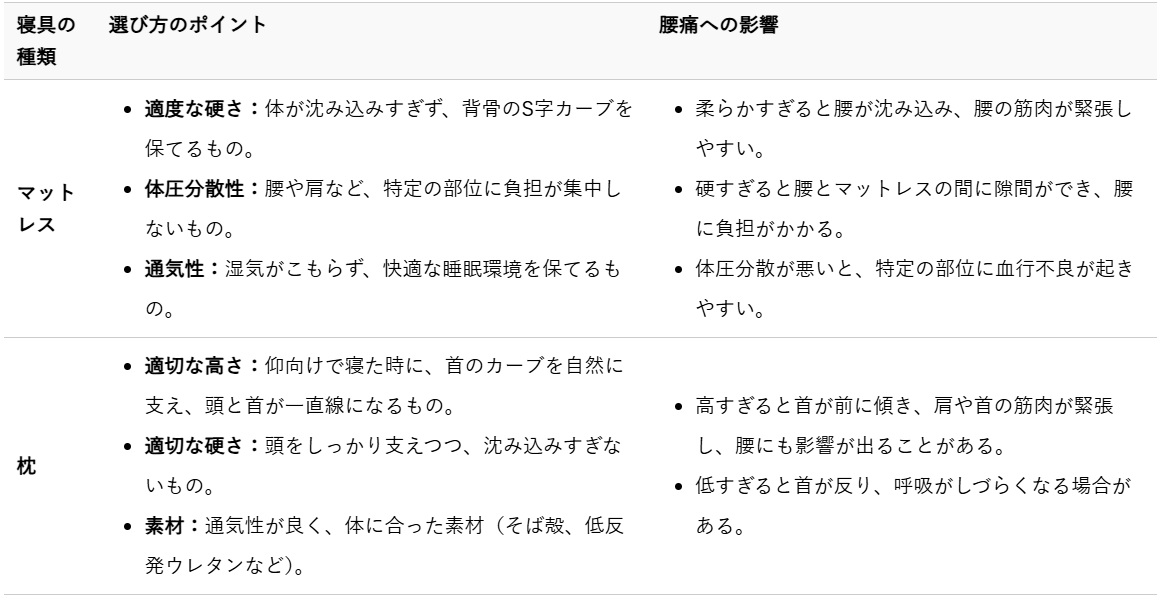 マットレスや枕は、寝姿勢を支える土台となるため、腰痛対策において非常に重要です。ご自身の体格や寝姿勢に合ったものを選ぶようにしましょう。