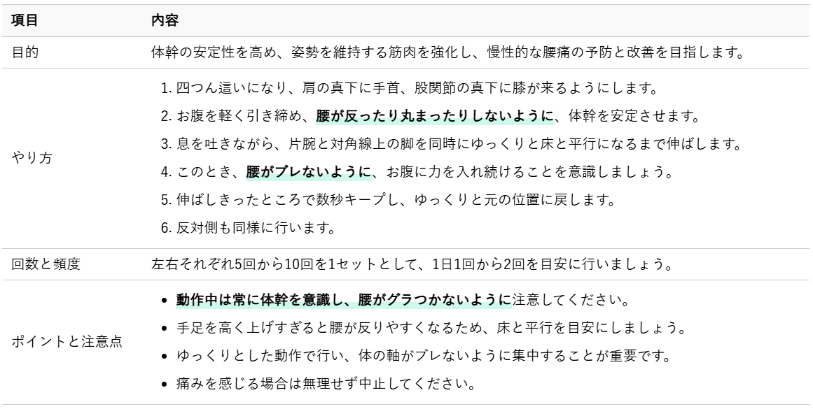バードドッグは、体幹の安定性とバランス感覚を養うのに効果的なエクササイズです。対角線上の手足を同時に動かすことで、体幹のインナーマッスルを効率よく鍛え、腰の安定性を向上させます。これもストレッチと体幹トレーニングの中間的な位置づけですが、慢性腰痛の改善には欠かせない動きです。