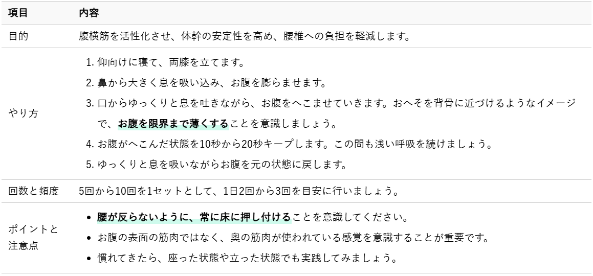 ドローインは、お腹の深層部にある腹横筋というインナーマッスルを鍛える基本的なエクササイズです。腹横筋はコルセットのように腰を安定させる役割があり、この筋肉を意識的に使うことで、腰痛の予防や改善に繋がります。ストレッチというよりは筋力トレーニングに近いですが、柔軟性と安定性の両面から腰痛にアプローチするため、ここでご紹介します。
