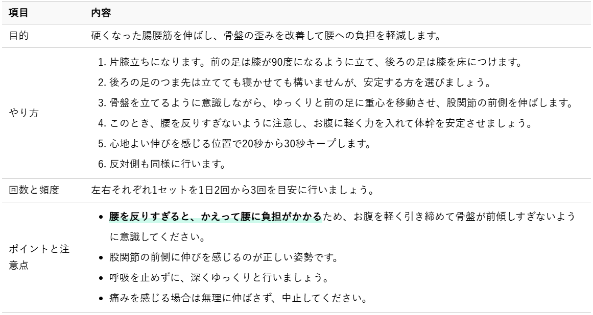 腸腰筋は、腰椎から股関節の内側にかけて位置する深層筋で、座りっぱなしの姿勢や運動不足によって硬くなりがちです。この筋肉が硬くなると、骨盤が前傾しやすくなり、腰椎の反りが強まって腰痛を引き起こすことがあります。このストレッチで腸腰筋をしっかり伸ばし、骨盤のバランスを整えましょう。