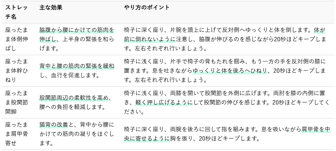 これらのストレッチをこまめに取り入れることで、デスクワークによる腰への負担を軽減し、集中力の維持にもつながります。長時間座りっぱなしにならないよう、定期的に体を動かすことを意識してください。