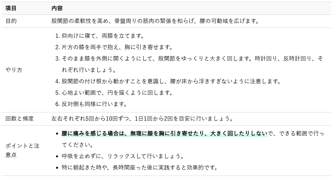 股関節の可動域を広げることは、腰への負担を軽減し、骨盤の安定性を高める上で非常に重要です。このストレッチは、仰向けで行うため、腰への負担が少なく、リラックスして股関節の動きをスムーズにすることができます。