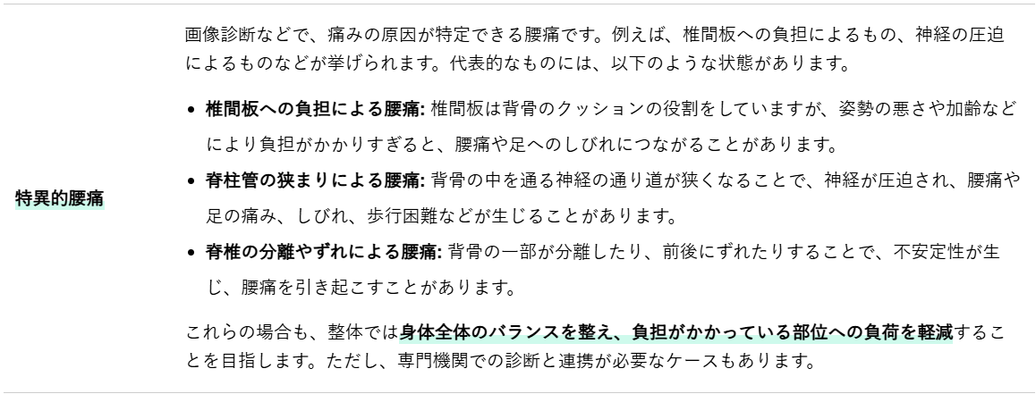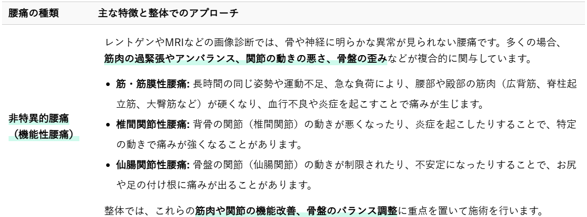 腰痛は大きく分けて、特定の原因が画像診断などで特定できる「特異的腰痛」と、原因が特定しにくい「非特異的腰痛(機能性腰痛)」に分類されます。