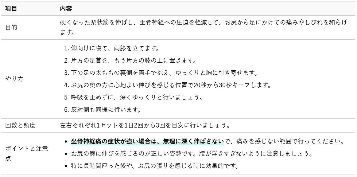 梨状筋は、お尻の奥深くにある小さな筋肉ですが、坐骨神経のすぐそばを通っているため、この筋肉が硬くなると坐骨神経を刺激し、痛みやしびれを引き起こすことがあります。このストレッチで梨状筋を丁寧に伸ばし、神経への圧迫を軽減しましょう。