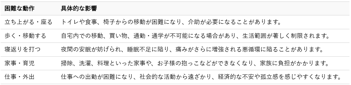 腰痛で歩けない状態は、私たちの当たり前の生活を大きく制限してしまいます。単に移動ができないというだけでなく、さまざまな動作に支障をきたし、生活の質を著しく低下させる可能性があります。