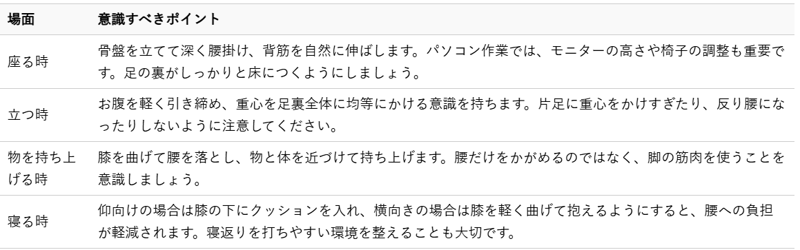 特に、長時間同じ姿勢でいることや、無理な体勢での動作は腰痛の大きな原因となります。以下の点に注意し、腰への負担を最小限に抑える意識を持ちましょう。