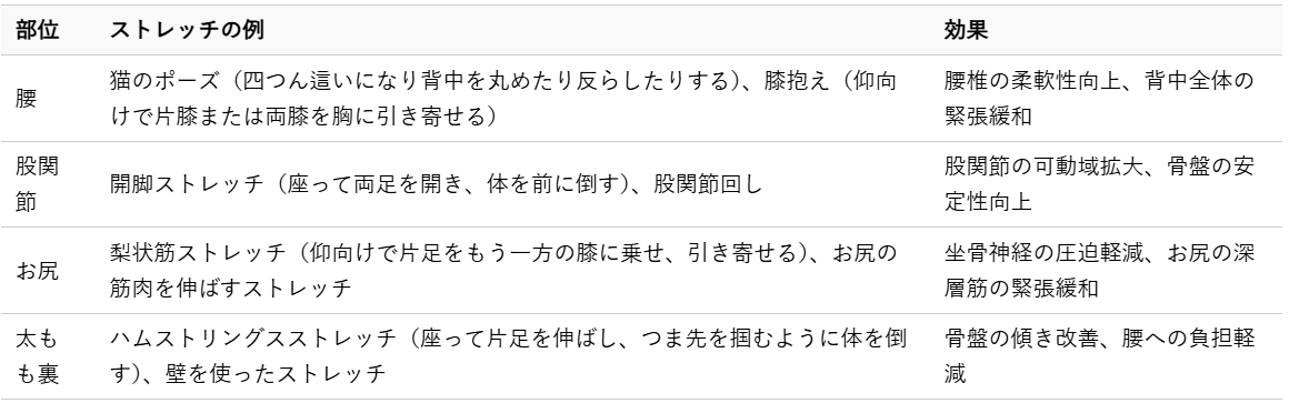 特に、腰周辺だけでなく、股関節やお尻、太ももの裏側など、腰痛に関連する部位の柔軟性を高めるストレッチが効果的です。無理のない範囲で、毎日少しずつでも続けることが大切です。