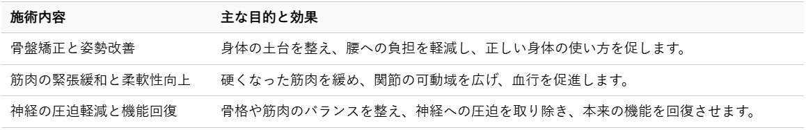 整体では、お客様一人ひとりの身体の状態を詳細に分析し、「歩けない腰痛」の根本原因に合わせたオーダーメイドのアプローチを行います。主な施術内容は以下の通りです。