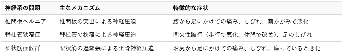 これらの神経系の問題は、腰痛だけでなく、足のしびれや筋力低下を伴うことが多く、歩行を著しく困難にさせます。特に、片足だけにしびれや痛みが強く出る場合は、神経の圧迫が疑われます。