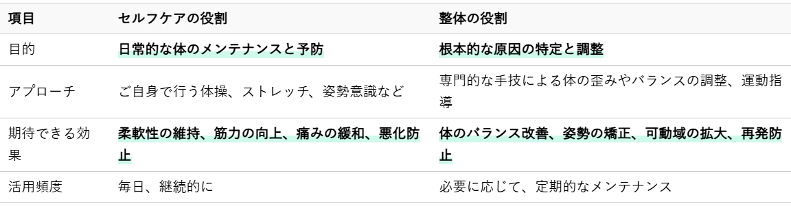 セルフケアで日々の予防と軽度な対処を行い、整体で体の土台を整え、専門的なアドバイスを受ける。この両輪が揃うことで、あなたは腰痛の悩みから解放され、活動的で快適な毎日を取り戻すことができるでしょう。