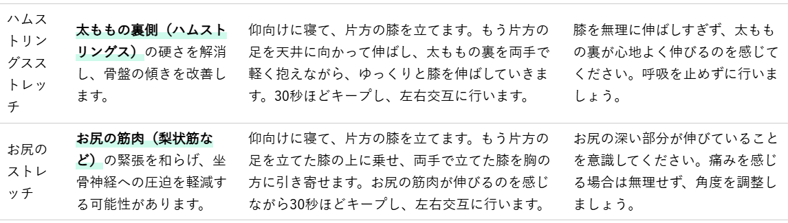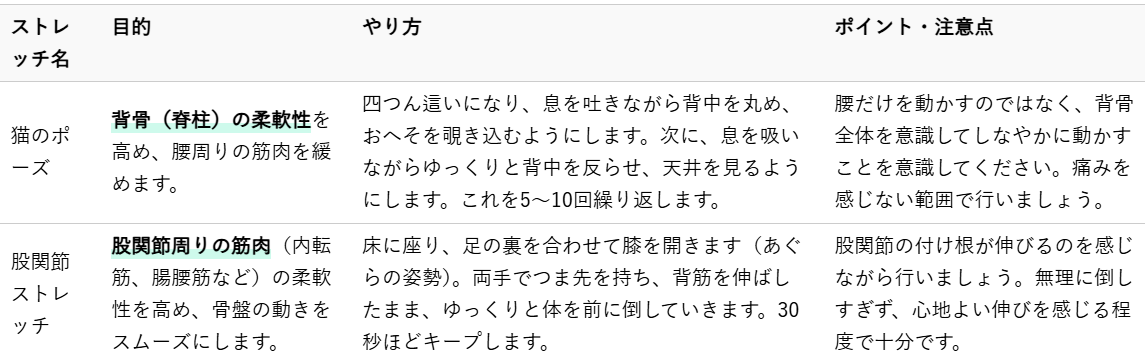 腰痛の原因の一つに、股関節や太もも、お尻周りの筋肉の硬さがあります。これらの筋肉が硬いと、骨盤の動きが制限され、腰に余計な負担がかかりやすくなります。ここでは、腰痛改善に役立つストレッチをご紹介します。