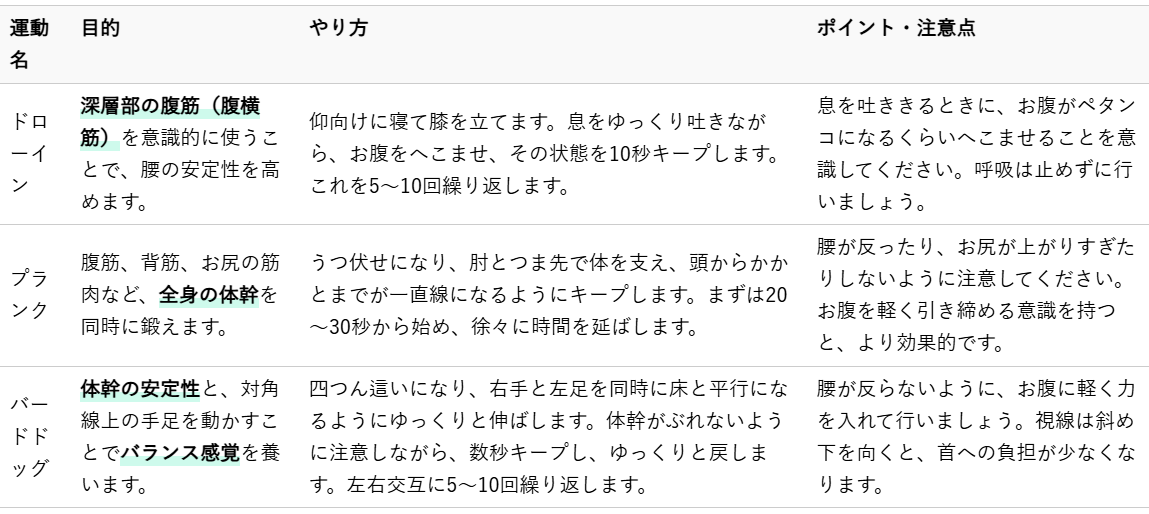 これらの運動は、腰痛改善に非常に効果的ですが、大切なのは無理なく続けることです。ご自身の体調と相談しながら、できる範囲で日々の生活に取り入れてみてください。