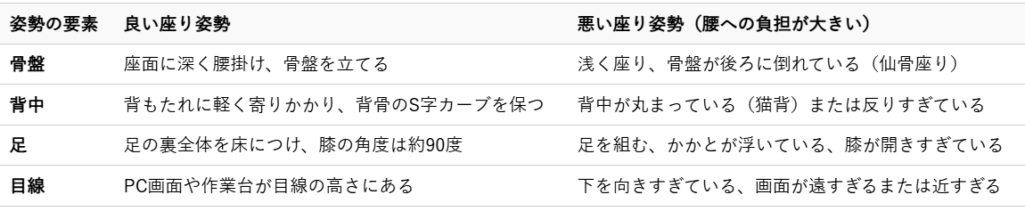長時間のデスクワークや運転など、座る時間が長い現代において、座り姿勢は腰痛に直結しやすい要因の一つです。骨盤を立て、背骨の自然なS字カーブを保つことを意識しましょう。