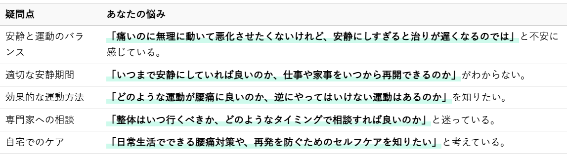 1. 腰痛の悩み 安静と運動の判断に迷うあなたへ