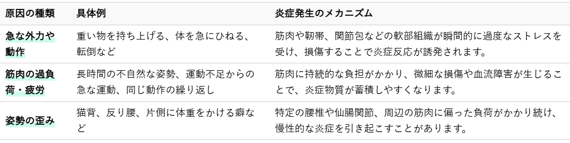 腰に炎症を引き起こす原因はいくつか考えられます。特に、以下のような状況で炎症性の腰痛が発生しやすい傾向にあります。
