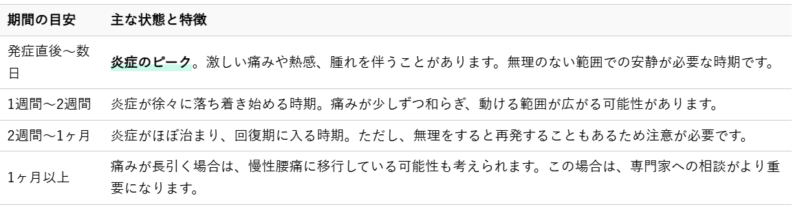 腰痛における炎症は、発症から回復までの期間が患者様の状態や原因によって大きく異なります。特に急性腰痛の場合、炎症は発症直後から数日間がピークとなり、この時期に強い痛みを感じることが多いです。