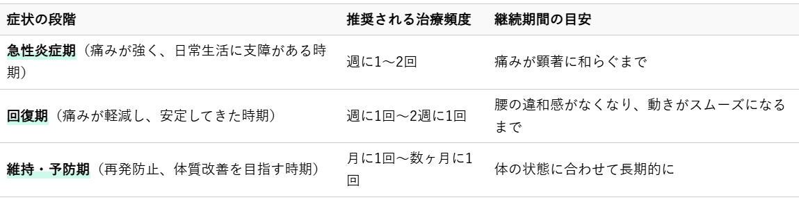 腰痛の炎症期間を短縮し、根本的な改善を目指すためには、単発の施術に頼るのではなく、症状や体質に合わせた継続的な治療計画が不可欠です。特に炎症期の腰痛は、段階的なアプローチで痛みの緩和と炎症の抑制を図り、その後は再発予防へと移行していくことが理想的です。