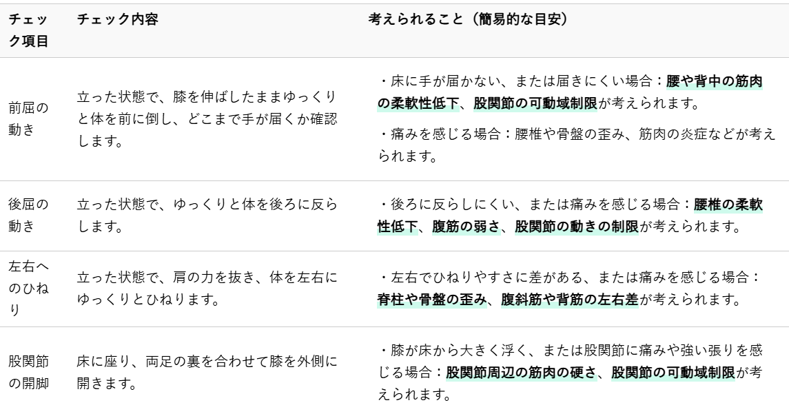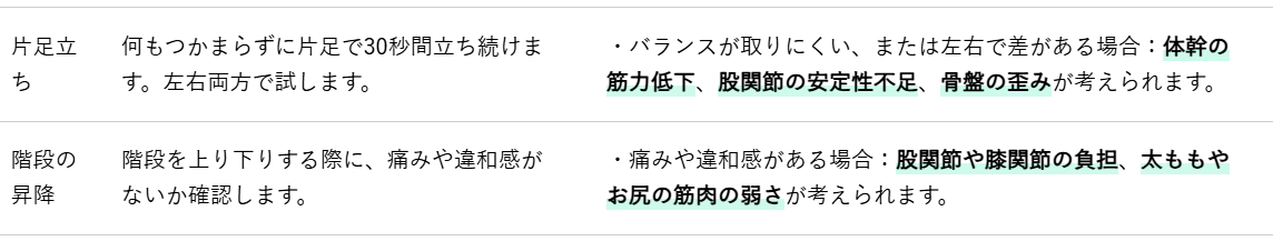 ご自身の腰や股関節の状態を把握するために、自宅で簡単にできるチェック項目をご紹介します。これらのチェックはあくまで簡易的なものであり、診断に代わるものではありませんが、ご自身の体の変化に気づくきっかけとして活用してください。