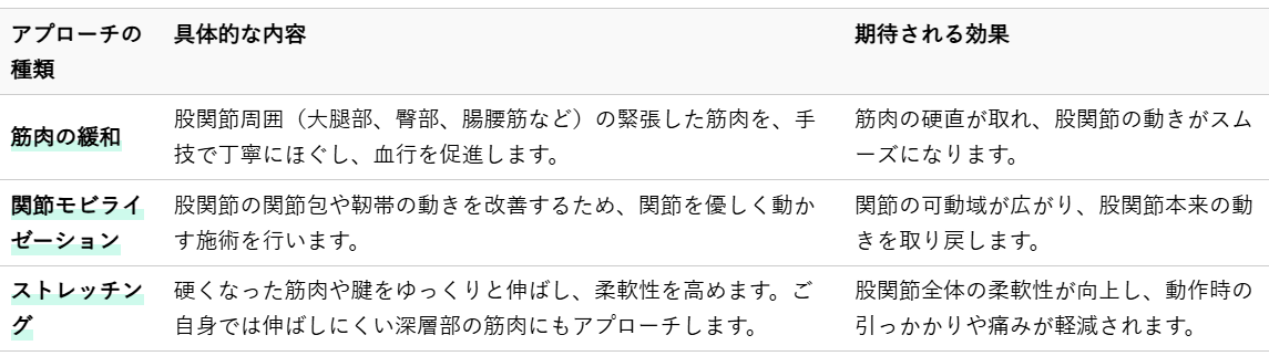 整体では、股関節の柔軟性を取り戻すために、以下のような手技やアプローチを組み合わせます。