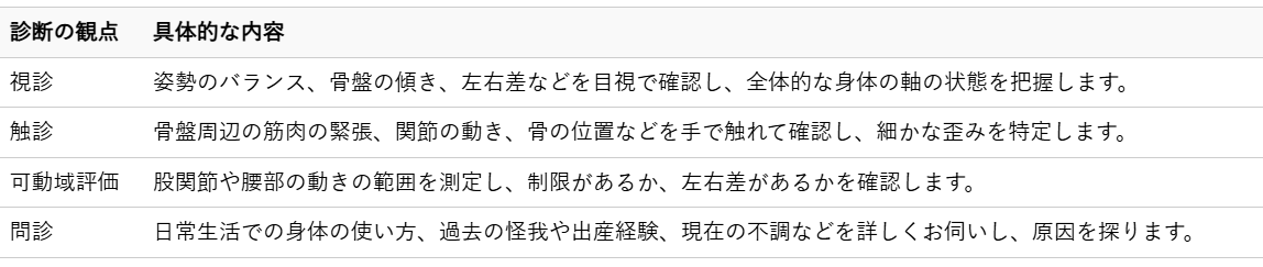 整体での骨盤矯正は、まず専門家による詳細な診断から始まります。お客様の骨盤がどのような状態にあるのか、どこに歪みが生じているのかを、経験豊富な施術者が丁寧に評価します。単に痛みのある箇所を施術するのではなく、身体全体のバランスを見極め、骨盤の歪みの根本的な原因を特定することが重要です。