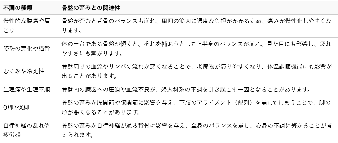 骨盤の歪みが引き起こす代表的な身体の不調を以下にまとめました。