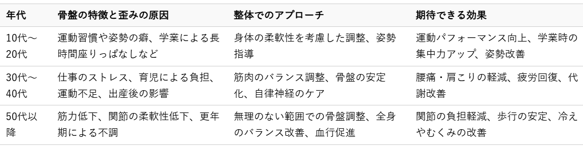 骨盤の歪みは、特定の年齢層に限らず、日々の生活習慣や姿勢、出産などが原因で誰にでも起こりうるものです。そのため、骨盤矯正は年齢を重ねてからでも十分に効果を実感できます。重要なのは、ご自身の骨盤の状態を正確に把握し、その状態に合わせた施術を受けることです。