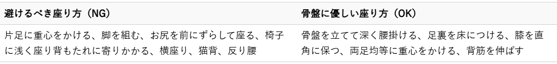 - 座り方: 椅子に浅く座る、お尻の片側に重心をかける、横座りやぺたんこ座りなども骨盤に悪影響を与えます。