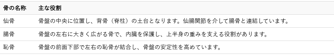 私たちの体の土台となる骨盤は、複数の骨が組み合わさってできています。主に以下の骨で構成されており、それぞれが連携して体のバランスを保っています。