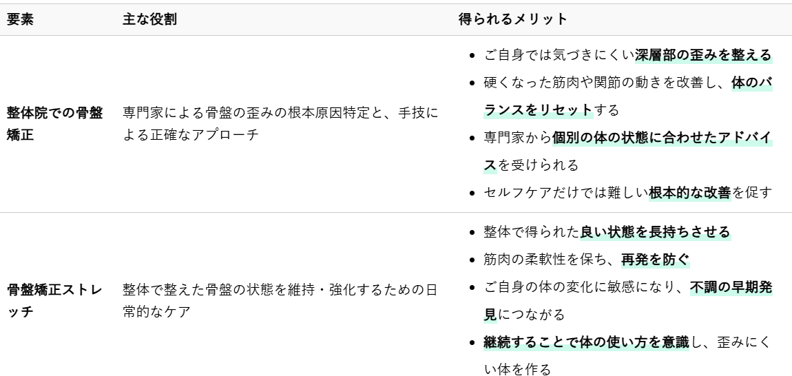 整体院での専門的な骨盤矯正と、ご自宅での骨盤矯正ストレッチを組み合わせることは、単独で行うよりもはるかに高い効果が期待できます。それぞれの役割とメリットを理解し、上手に活用することで、骨盤の健康を長期的に維持することが可能になります。