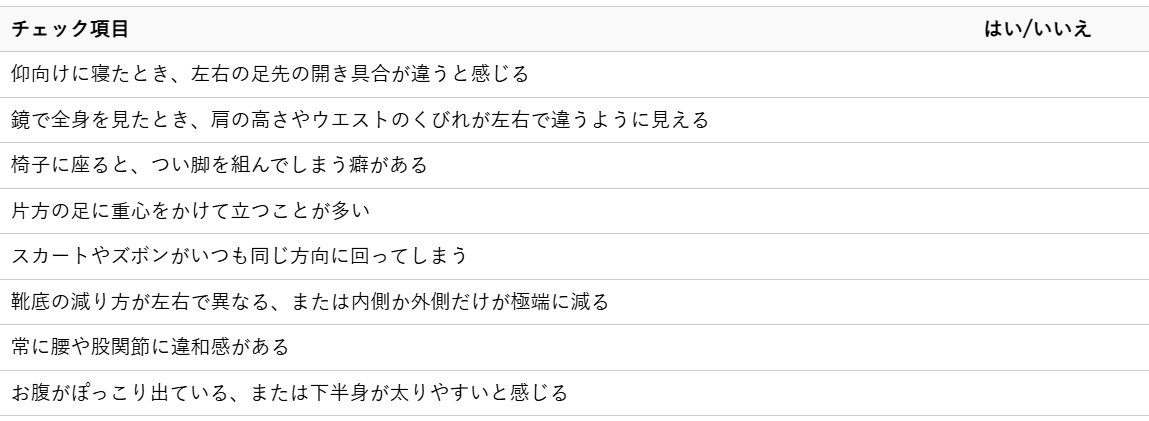 骨盤の歪みは、自分ではなかなか気づきにくいものです。しかし、いくつかの簡単なセルフチェックを行うことで、ご自身の骨盤が歪んでいる可能性を把握することができます。以下の項目に当てはまるものが多いほど、骨盤が歪んでいるかもしれません。