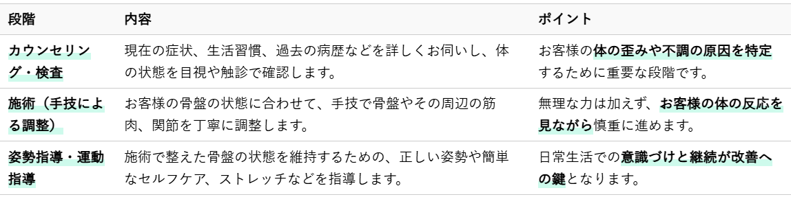 整体での骨盤矯正は、お客様の体の状態を正確に把握することから始まります。一般的な施術の流れと、その後のアフターケアについて確認しておきましょう。